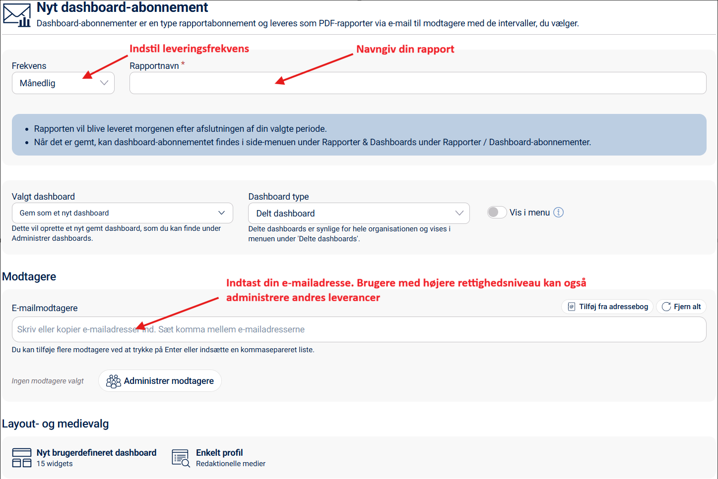 Du kan abonnere på dine dashboards og få dem sendt automatisk via e-mail med det tidsinterval, du selv vælger.