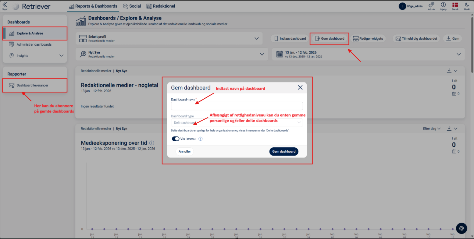 Muligheden for at gemme dashboards og oprette abonnement på dashboards afhænger af det rettighedsniveau, du er logget ind med. Hvis du ikke har denne funktion eller er i tvivl om, hvilke rettigheder du har, er du meget velkommen til at kontakte os på supportdanmark@retriever.dk.