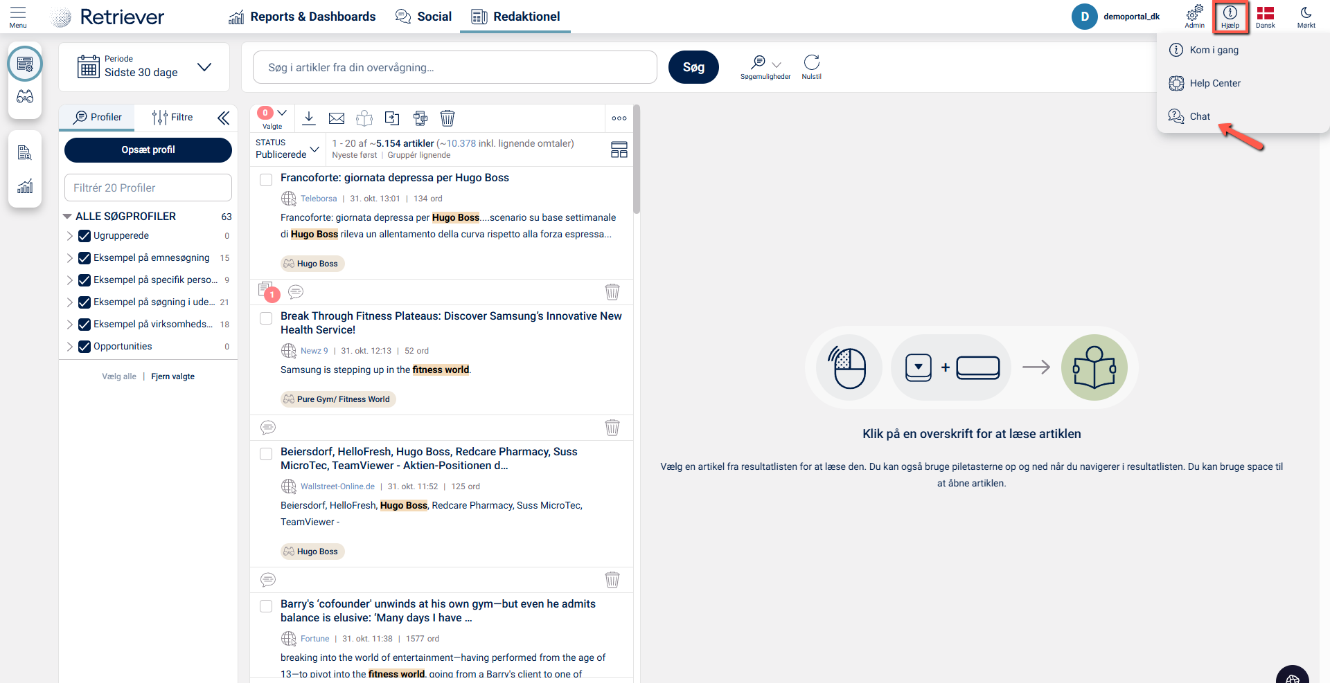 Hvor finder jeg chatten i Retrievers portal?Hvis du har adgang til chatten, finder du den øverst i højre hjørne under Hjælp