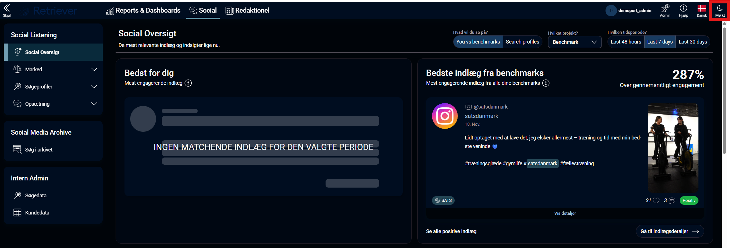 Ved at klikke øverst i højre hjørne, kan du ændre lystilstanden, hvis du ønsker den skal være mørk. Herefter vil det se ud som følgende: