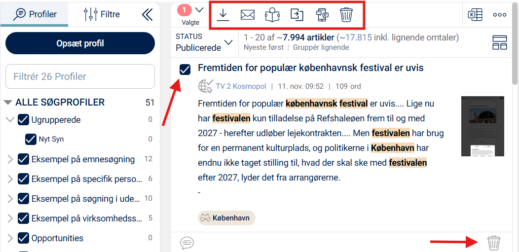 Flyt/Kopier – for at flytte eller kopiere artikler mellem ønskede søgeprofiler.