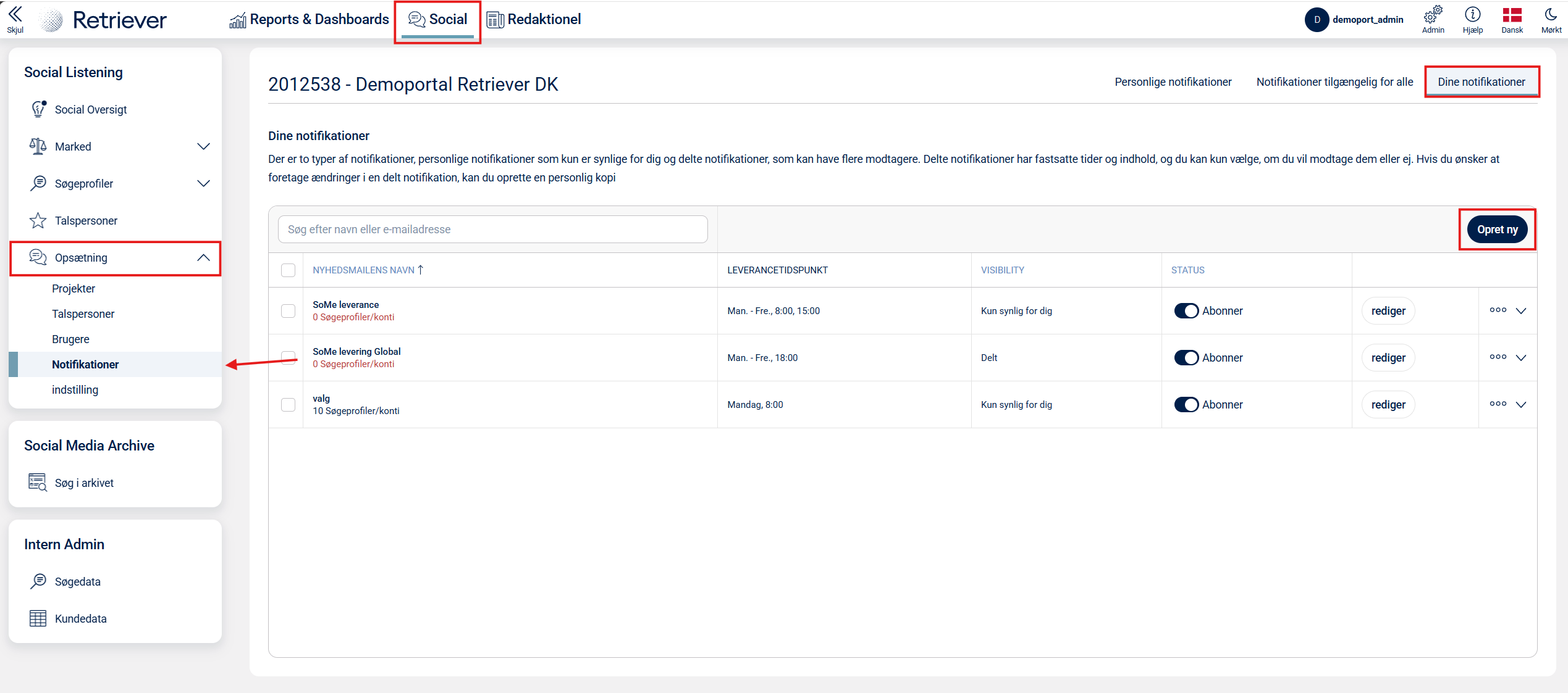 Vælg derefter "Notifikationer" til venstre, sørg for du er "Dine notifikationer". "Opret ny" til højre.