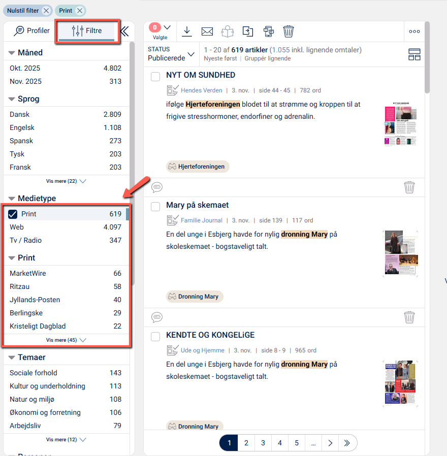 Klik på Filtre til venstre for artiklerne. Herunder er de forskellige kilder grupperet efter print, web og TV/radio, og du kan vælge hvilken kilde, du ønsker at se hits fra.