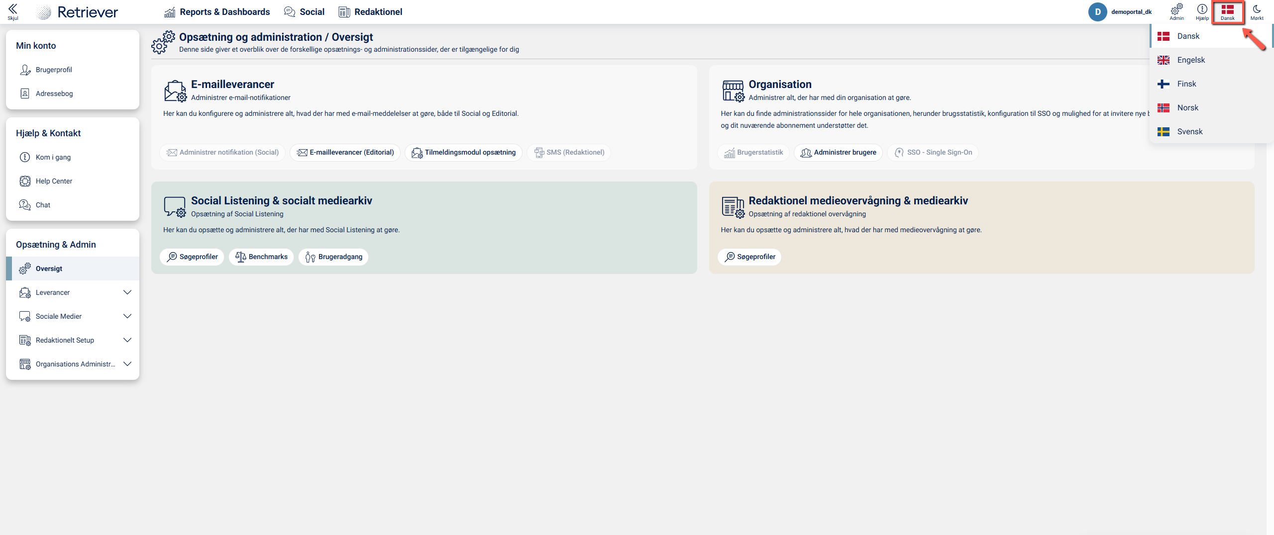 Hvordan ændrer jeg sprog i portalen?Du kan ændre sproget ved at klikke på flaget øverst i højre hjørne.