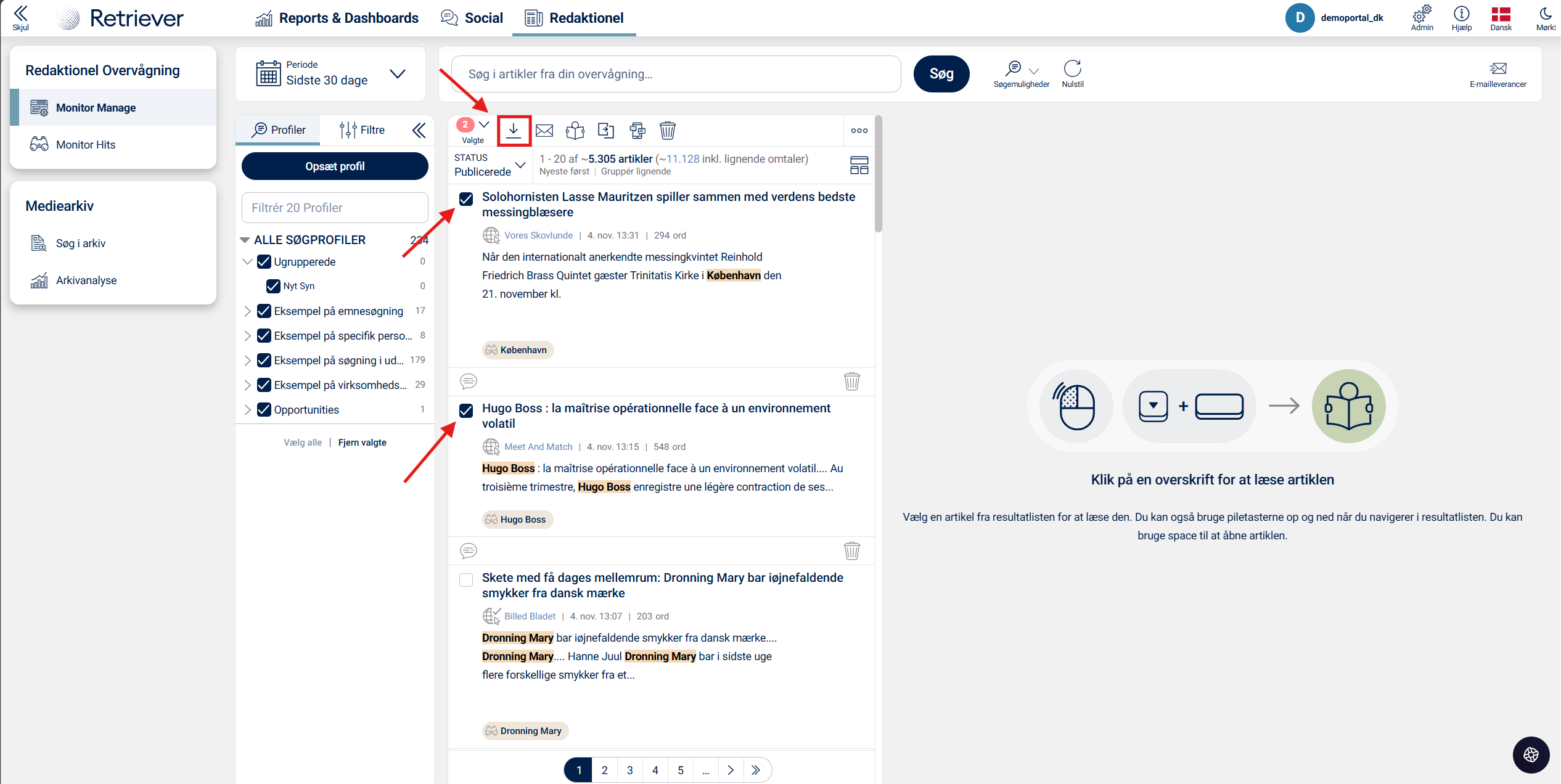 For at oprette en rapport, skal du vælge de artikler, du vil inkludere i din rapport, ved at markere afkrydsningsfelterne til venstre for artiklens overskrift. En rapport kan indeholde op til 500 hits. Når du har markeret de hits, du skal bruge, klikker du på Rapportér i menubjælken ovenover.