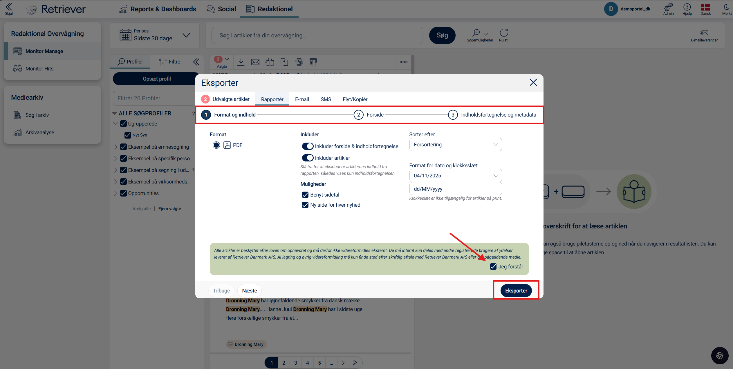 Før du eksporterer rapporten, skal du læse og acceptere vilkårene for ophavsret (i det gule felt).