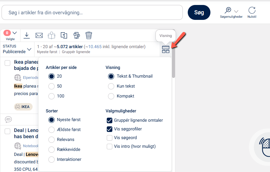 Klik på Visning i menulinjen, for at se de forskellige muligheder, for at få vist hits på, samt ændre hvor mange artikler og i hvilken rækkefølge, du ønsker at få vist.