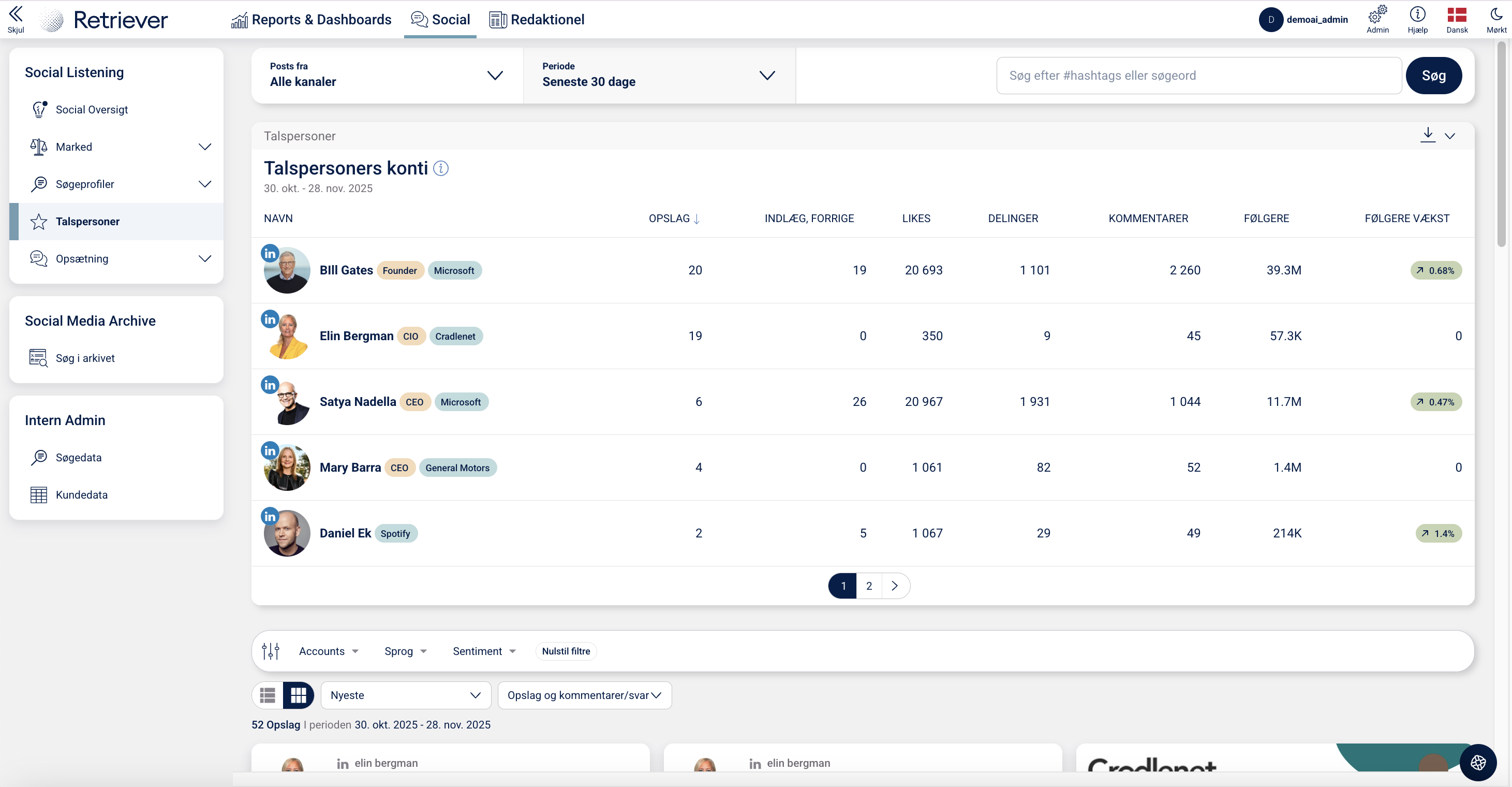 Med vores nye funktion til overvågning af talspersoner, kan du nemt følge og analysere de vigtigste influenter, der former samtalen om dit brand på sociale medier. Funktionen omfatter både dine egne talspersoner og dine konkurrenters, hvilket giver dig et bredt billede af jer selv i det sociale medielandskab. Herunder aktivitet, engagement, publikumvækst og tonalitet på tværs af sociale platforme.