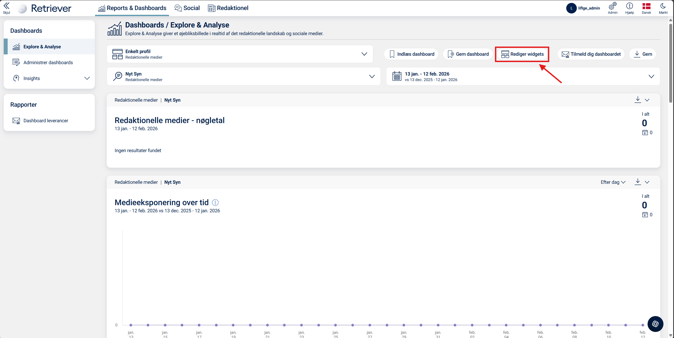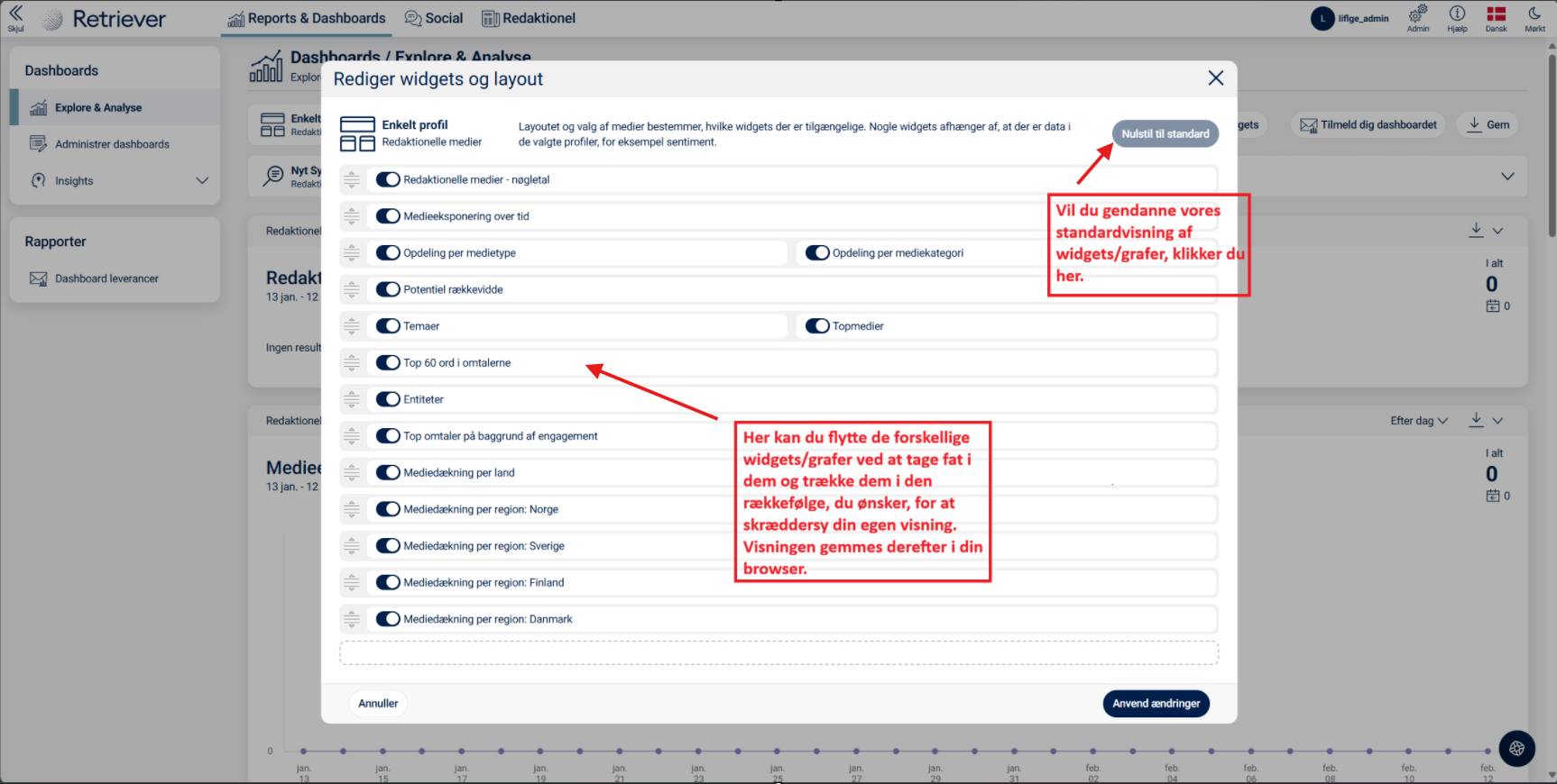 Muligheden for at redigere dashboards afhænger af det rettighedsniveau, du er logget ind med. Hvis du ikke har denne funktion eller er i tvivl om, hvilke rettigheder du har, er du meget velkommen til at kontakte os på supportdanmark@retriever.dk.