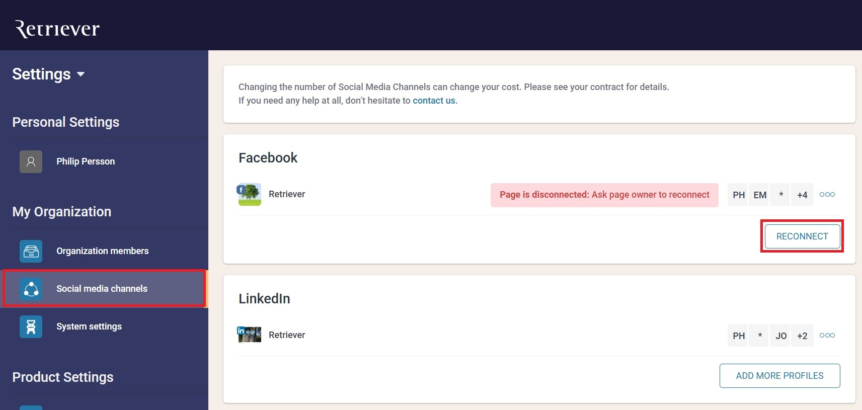 OBS: When it comes to TikTok, it works a bit differently — you’ll need to remove the page and then add it again for the connection to be restored.