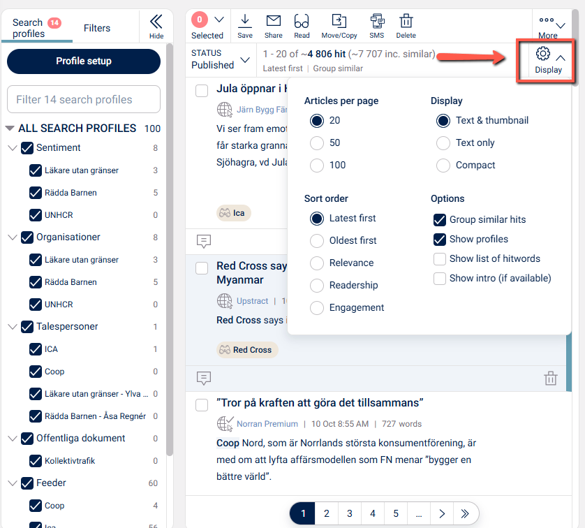 Yes you can. If you click on Display in the menu bar you can choose between different display settings that presents the hits in different ways. If you hide text you only see the headlines, if you choose title and source info you get the name of the source, and with show intro you get the text from the intro of the hit as well. If you choose show hit words you can see the part of the article where you search word is mentioned.