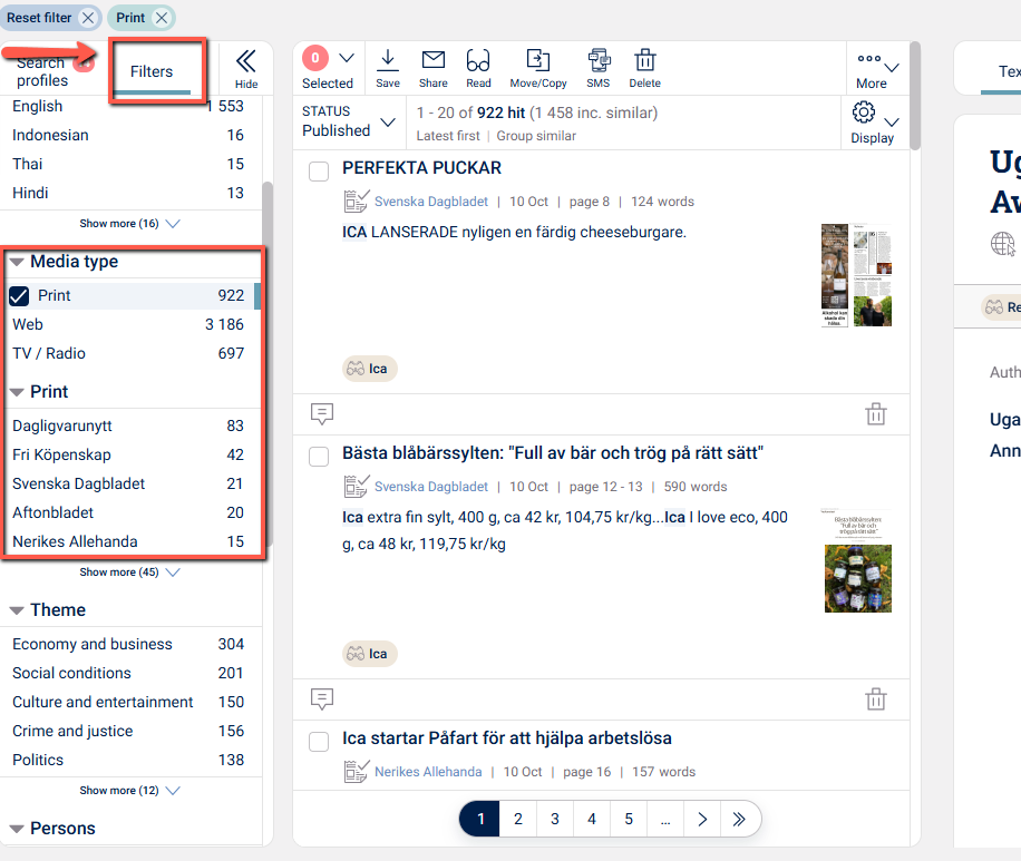 In Monitor, you will be able to filter the hits by their source. In the left column in Monitor , you will find the sources grouped by paper, web, and TV/radio. Here you can select the specific source you wish to see hits from.