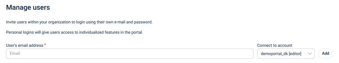 Now you can add the user's email address and connect them to the right account (user or editor). When you click Add, the user will receive an email to create their own user.