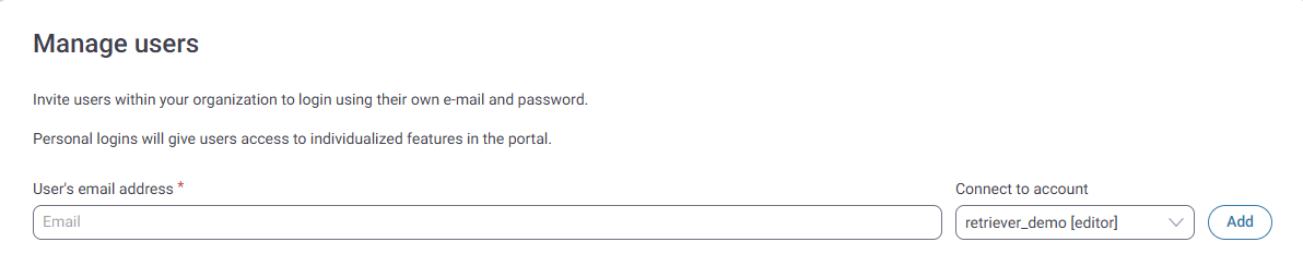 Now you can add the user's email address and connect them to the right account (user or editor). When you press Add, the user will receive an email to create their own user.