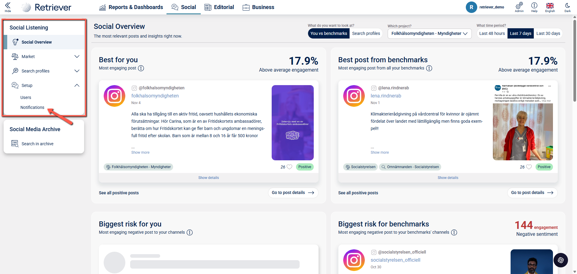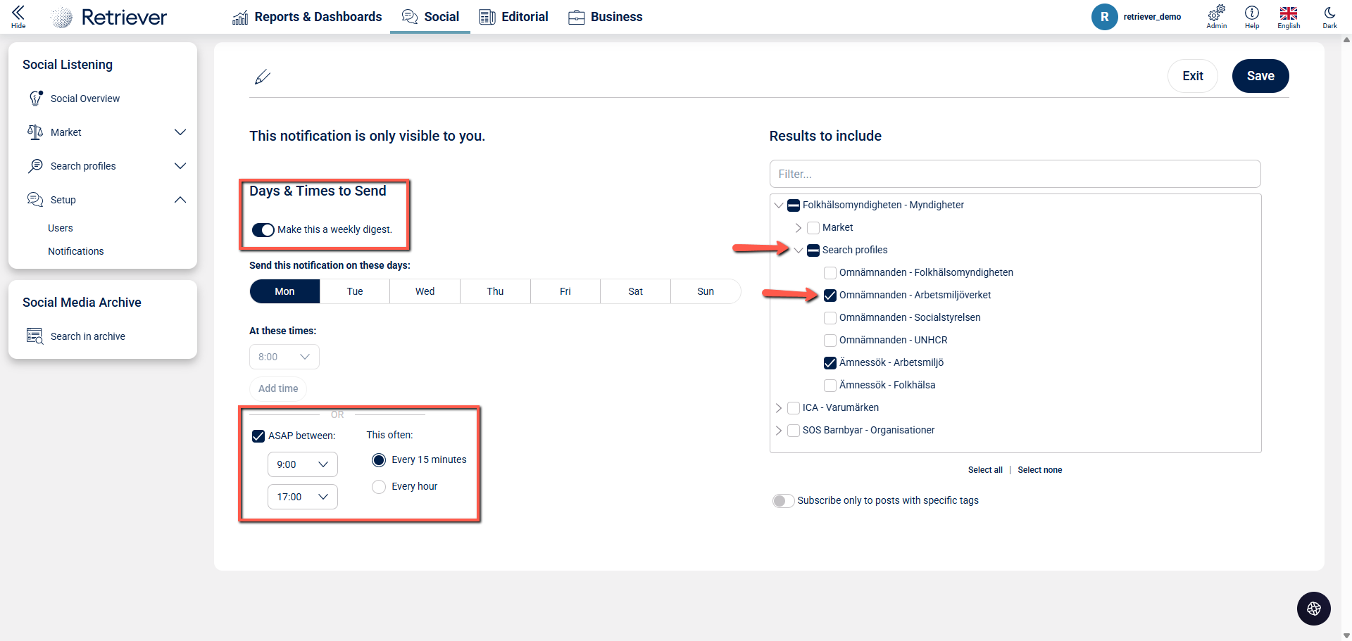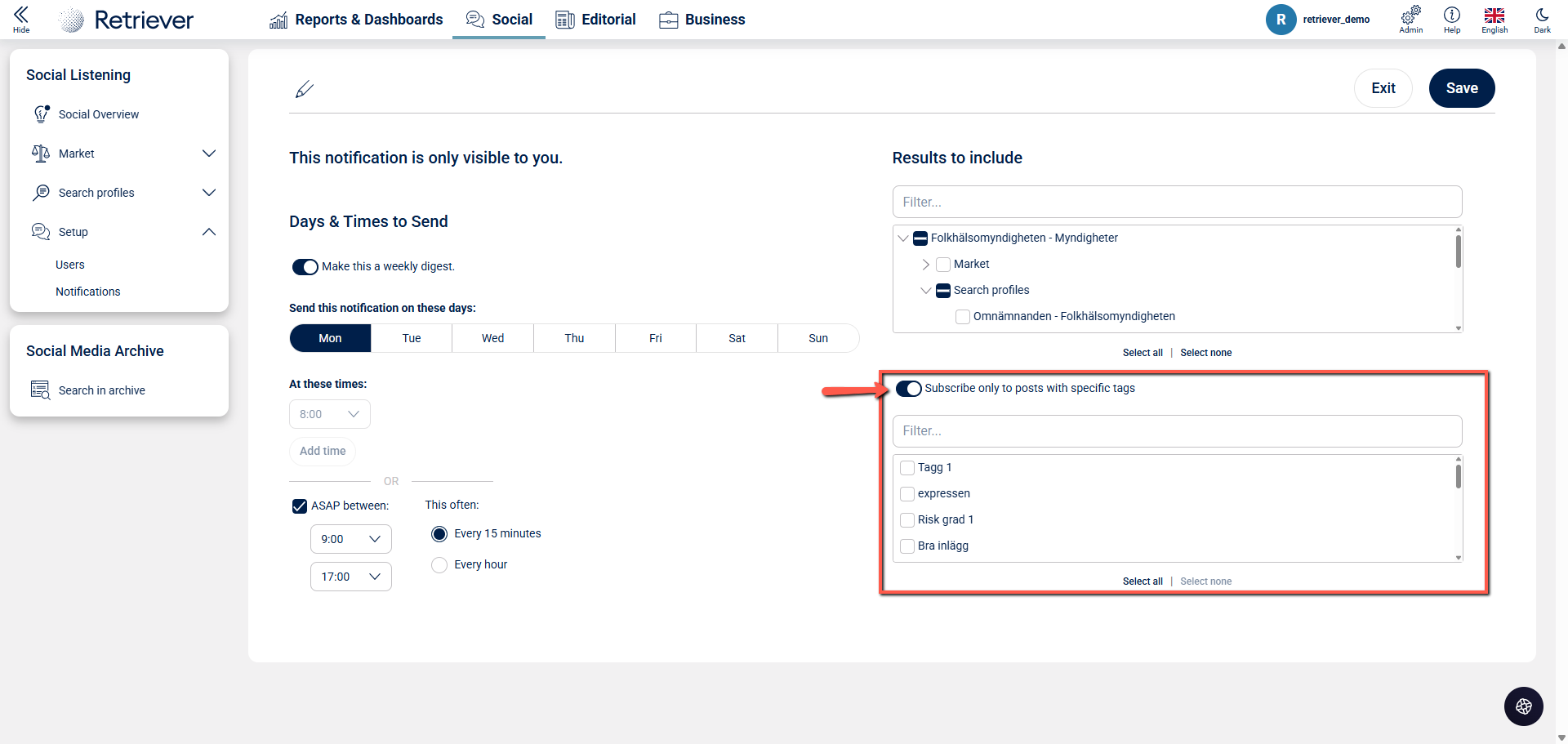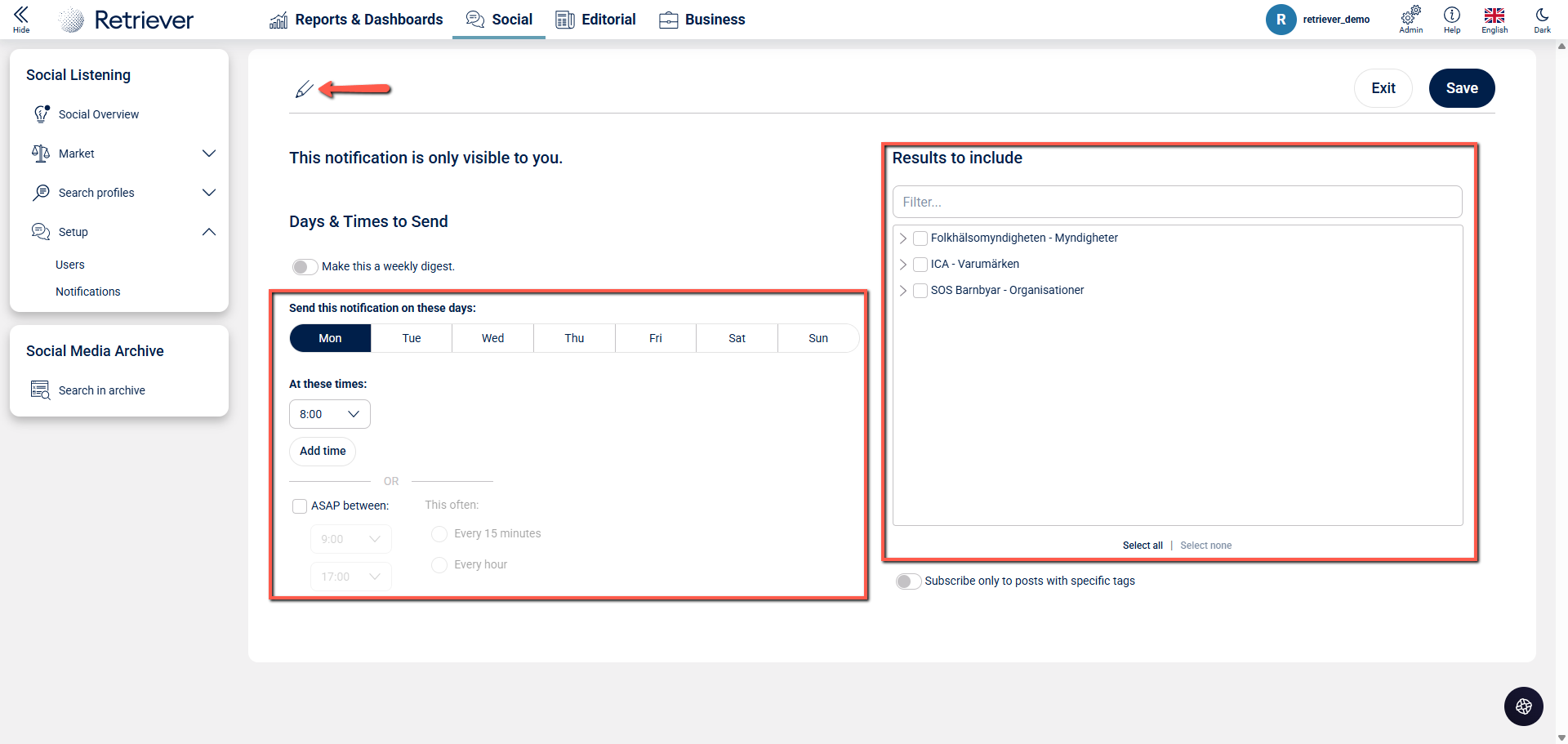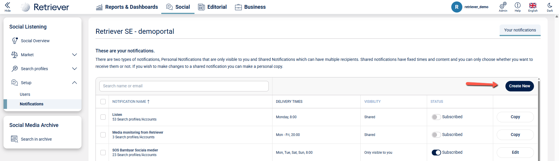 In Retriever Listen it is possible for users to tailor and manage their own notifications. This article will guide you through how you can adjust and create your own personal notifications. Follow these steps:
