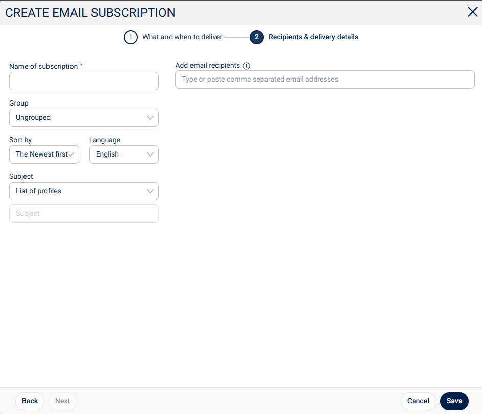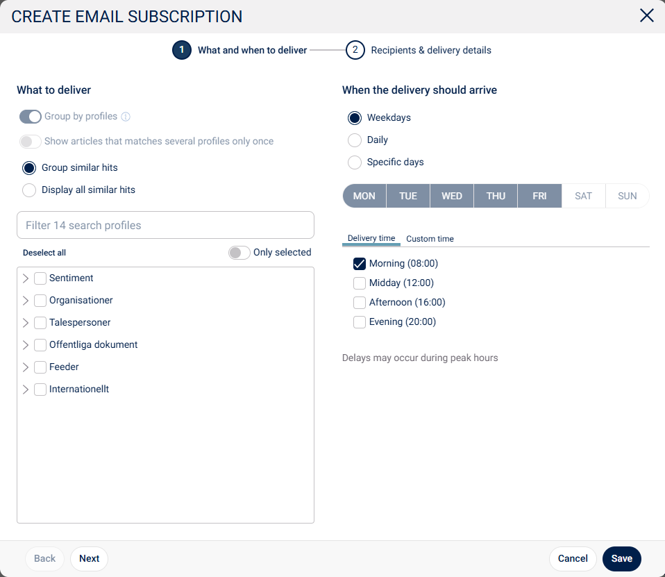 If you click on New subscription instead, another new window will open. Under What and when to deliver, you can control which profile(s) the recipient should receive news from and at what time.