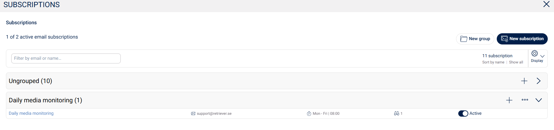 Below you can see what it looks like when the subscription group is created and an email subscriber is attached. If you click on +, you can add a new subscription to the group. If you click on the three dots, you can change the name of the recipient group or delete it.