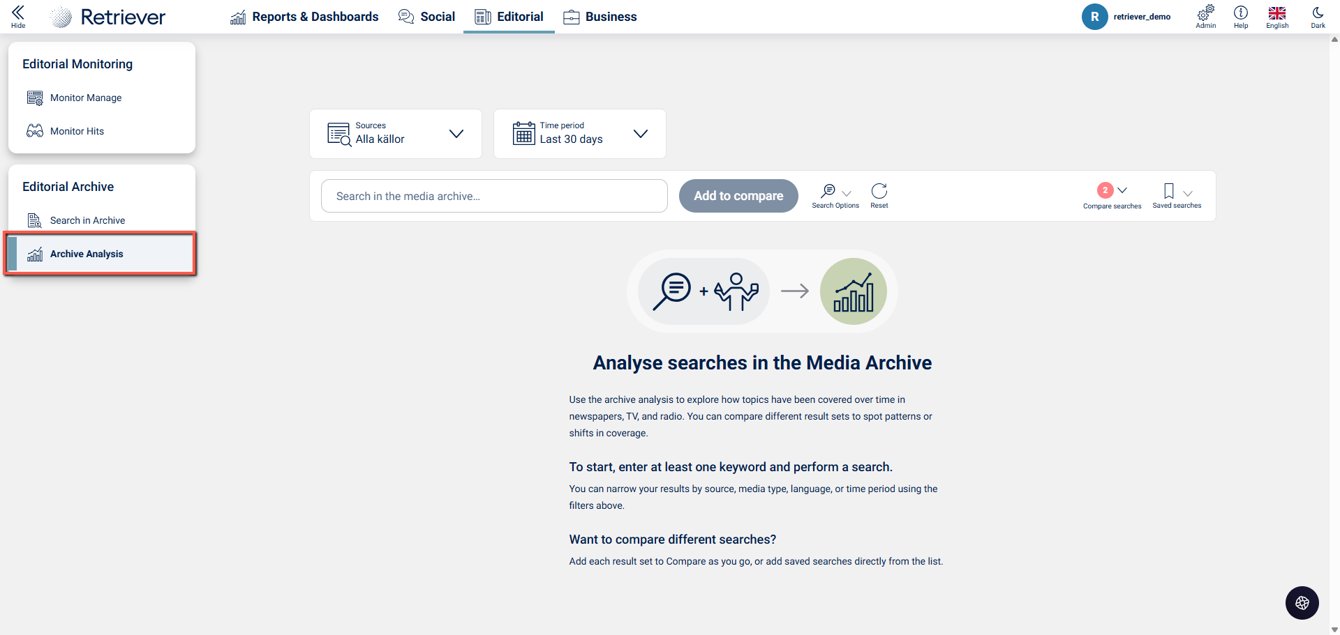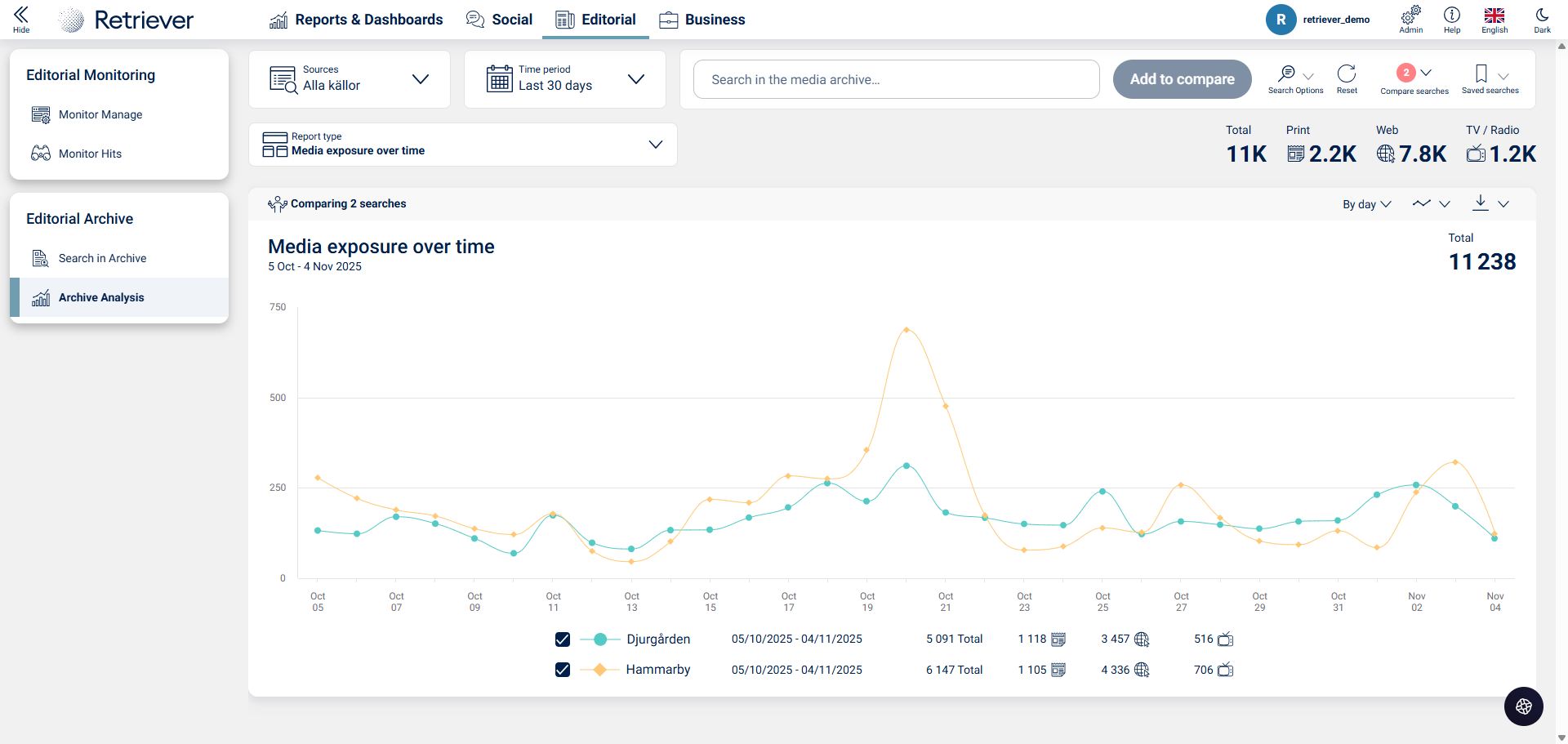 You can adjust the source selection and time period for all profiles in your comparison. You can also adjust the type of chart you want to see and save the chart in Excel, PNG or PDF.