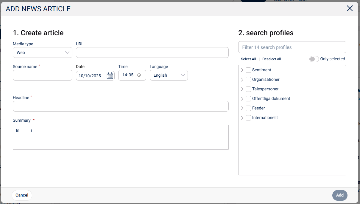 You may now add all article details to the pop-up window that opens. In the end remember to click Add. After adding the article, it can be found from the portal.