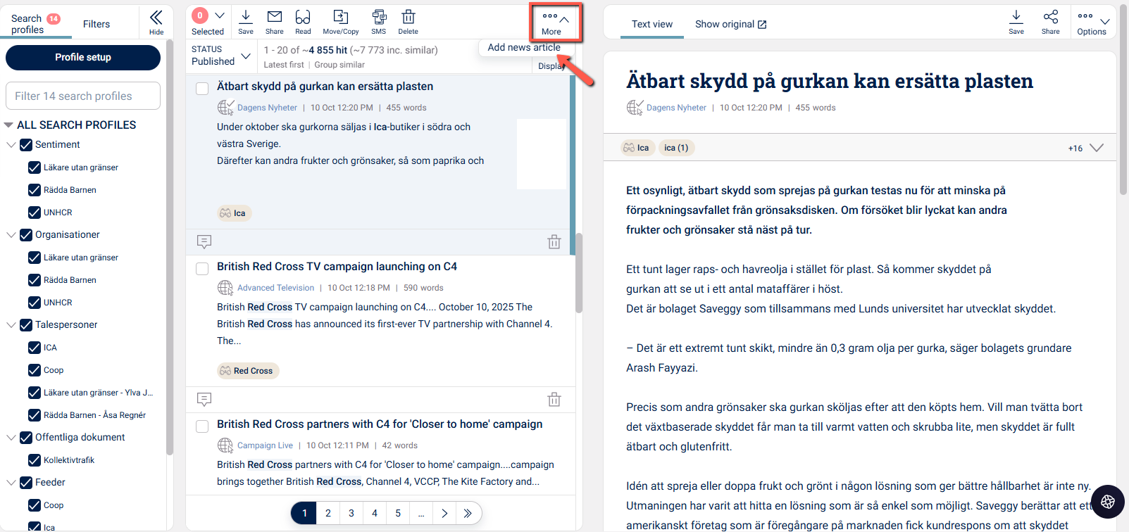 If you would like to add an article from a source that is not covered by your contract, you can add it manually to the portal in the following way. Go to Monitor -> Manage-> More -> Add News Article.
