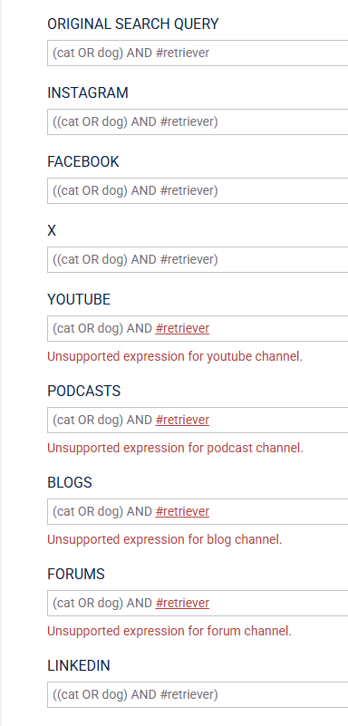 When creating a search, the tab Inspect can be used to see exactly how Listen has normalized the query for each channel. If any search operator is unavailable for a certain source, this will be shown here, and the operator might be excluded from the search for that particular channel.