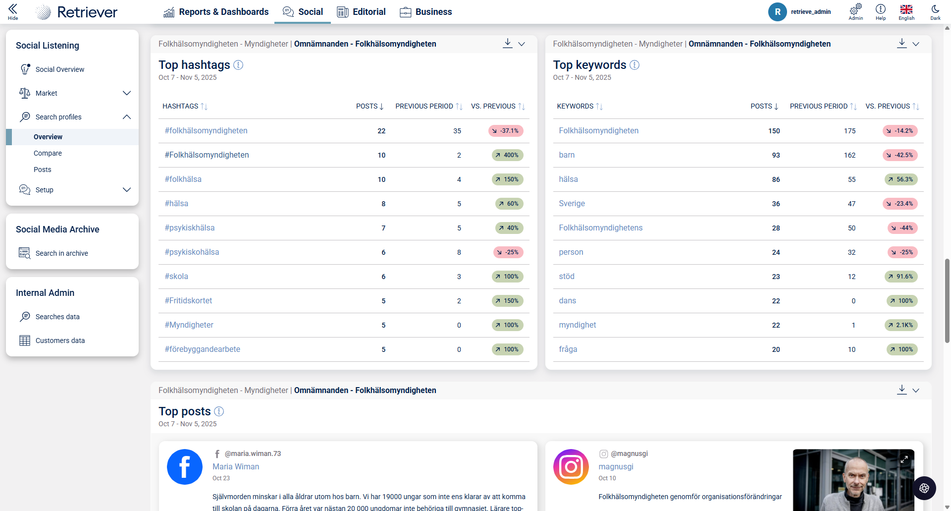 Besides the useful statistics like engagement and sentiment you will also find a overview of the most used hashtags, key words and popular posts.