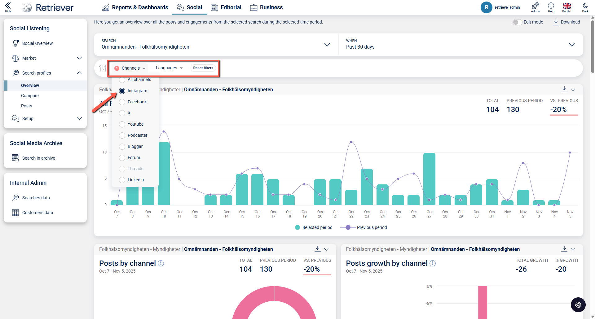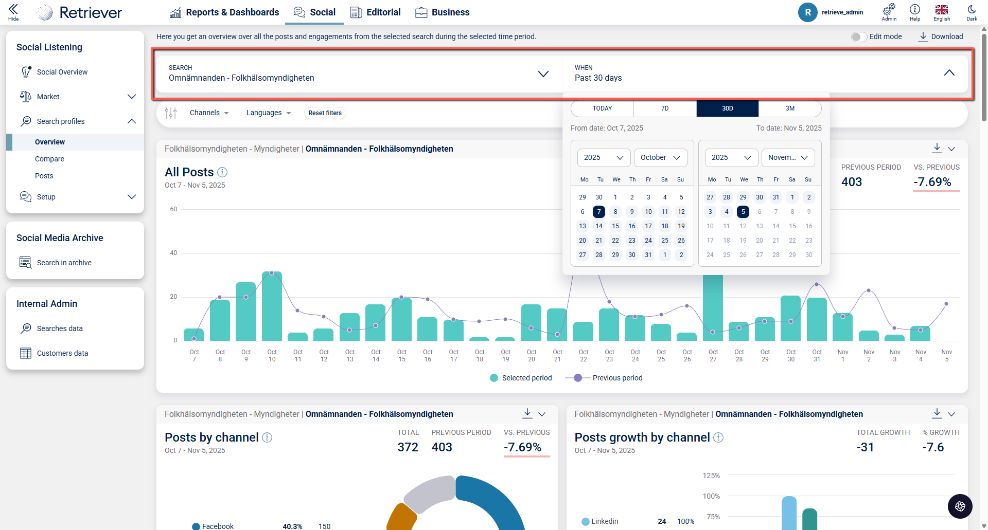 Here you will find combined statistics for the chosen search profile. You can select this as well as the relevant time period at the top of the page.