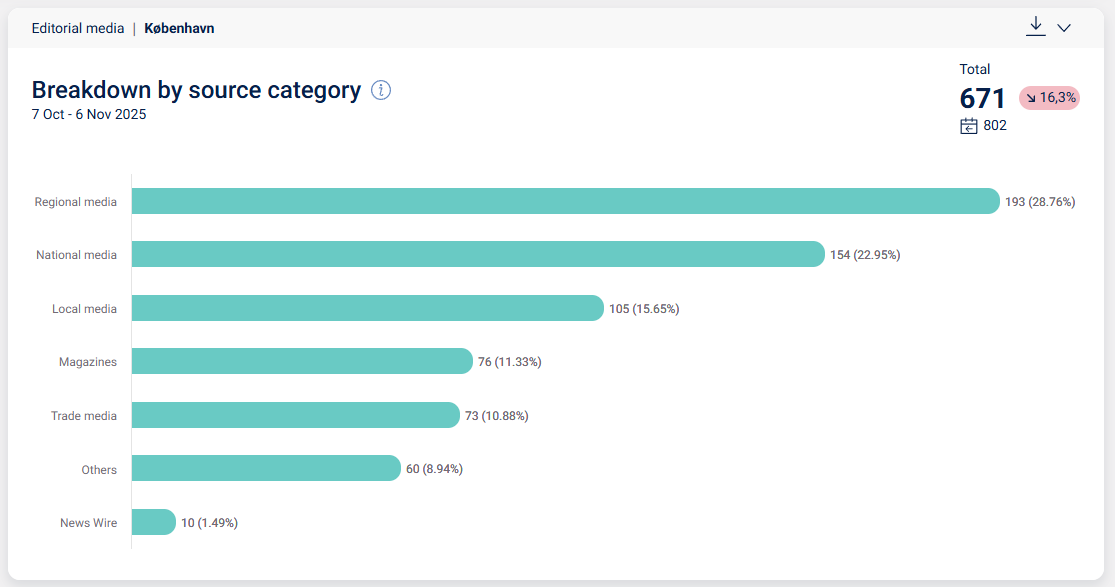Source categories are a more detailed way of classifying the media by type to gain a better understanding of where media coverage has occurred. Below, you can see an example of the categories available and how it may appear in the Retriever platform.