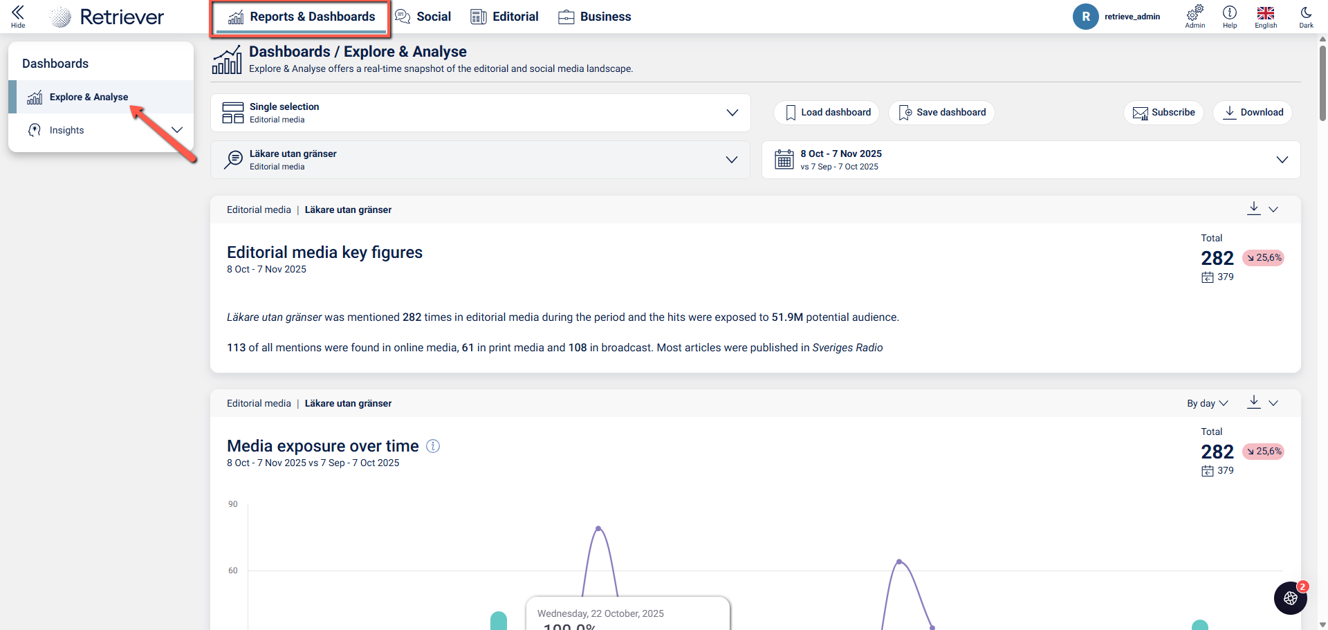 The tool Explore & Analyse is located under Reports & Dashboards and is an analytical tool where you can generate various charts of quantitative statistics. You can also compare your overall media coverage generated by the search profiles and keywords you have set up for editorial and social media in Monitor (editorial media) and Listen (social media) tools.