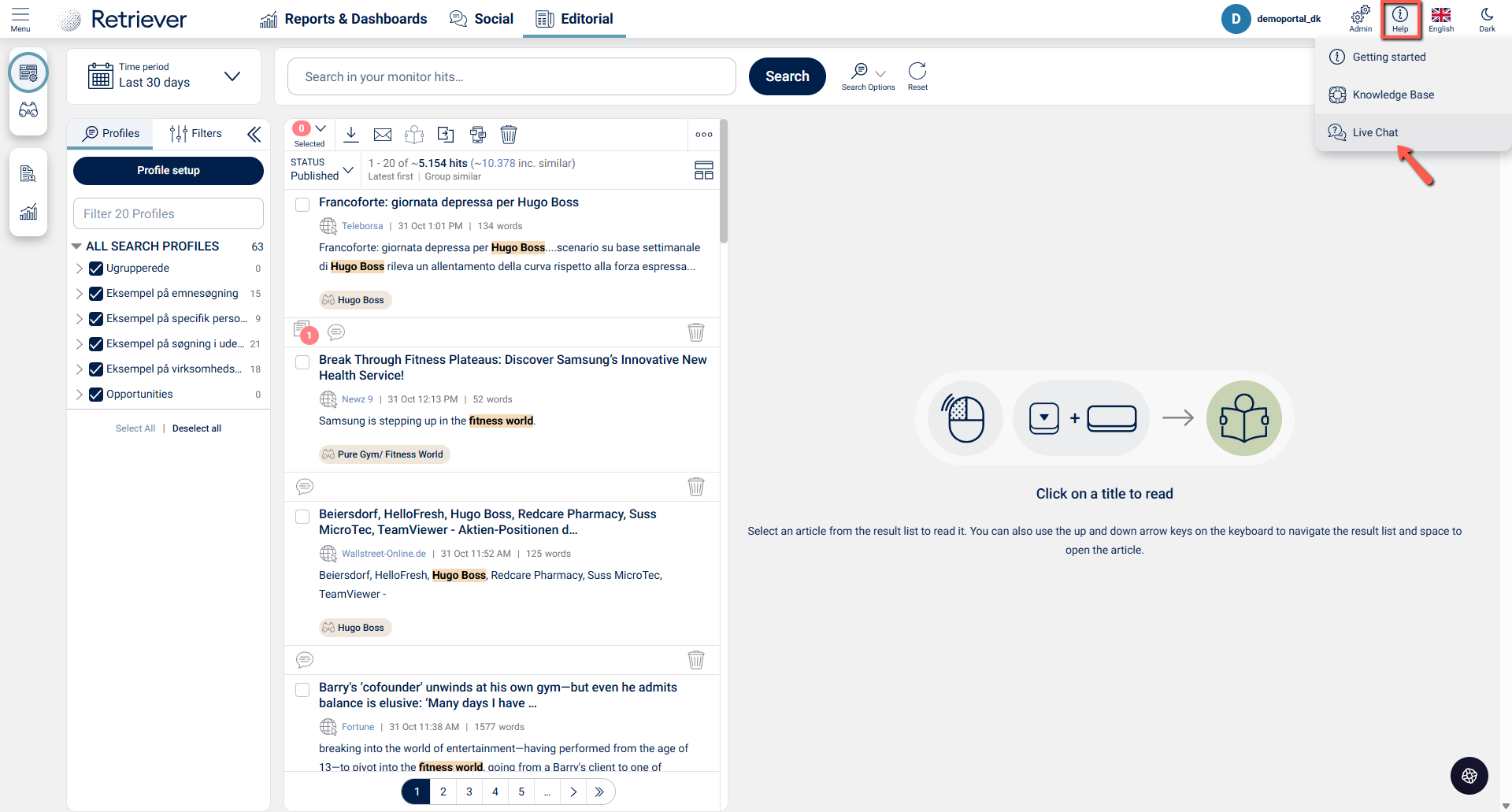 Where do I find the chat on the Retriever platform?If you have access to the chat, you'll find it in the top-right corner under "Help".