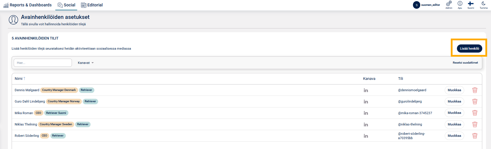Jos sinulla on Listeniin Customer Admin -tason tunnukset, voit itse lisätä haluamiasi avainhenkilöitä seurantaan.
