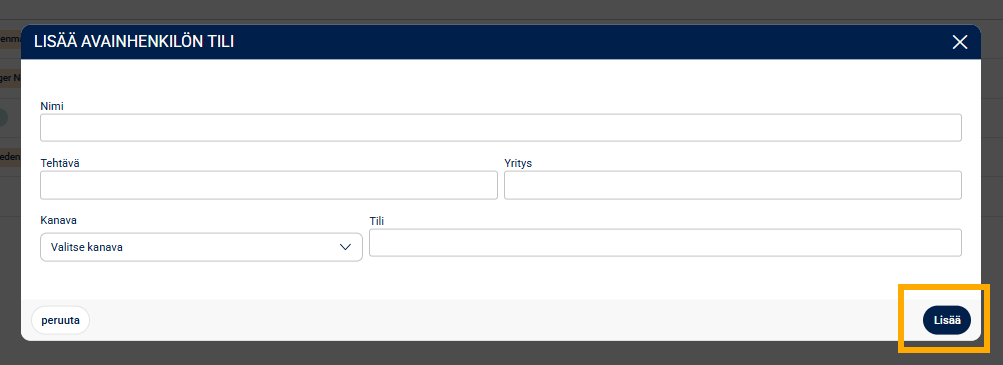 Tämän jälkeen täytä seurattavan henkilön tiedot ja klikkaa Lisää, jolloin henkilö ilmestyy Avainhenkilöiden listaukseen mukaan.