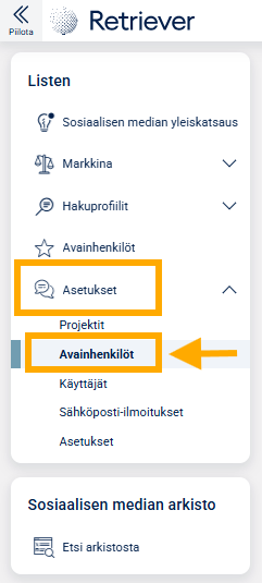 Pääset lisäämään henkilöitä valitsemalla oikeasta reunasta Asetukset ja sieltä Avainhenkilöt: