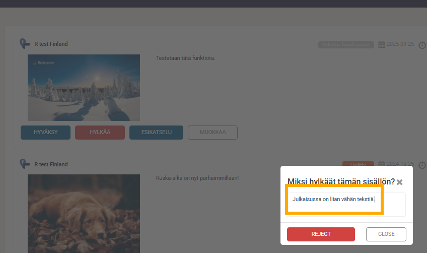 Jos haluat hylätä julkaisun, klikkaa Hylkää ja voit sen jälkeen kirjata syyn, miksi julkaisu hylätään ja sen jälkeen klikata Reject.