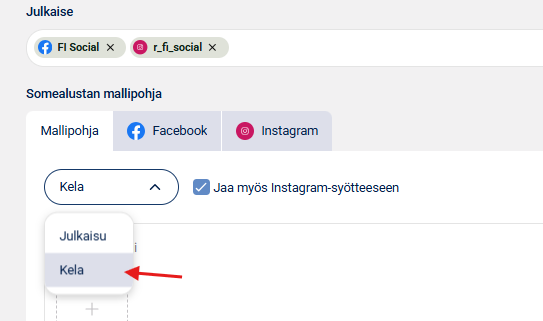 2. Valitse kanava(t), jolle haluat julkaista ja sen jälkeen alemmasta valikosta Kela. Kelan voit julkaista Facebookissa tai Instagramissa.