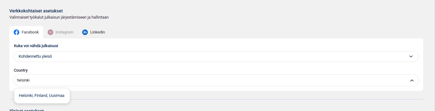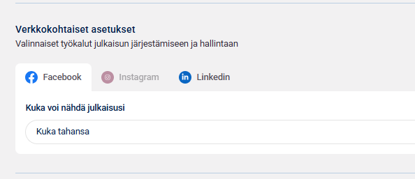 Luodessasi uutta julkaisua Facebookiin tai Linkediniin, siirry verkkokohtaisiin asetuksiin.