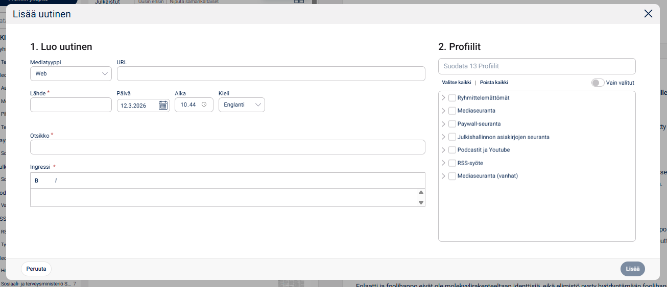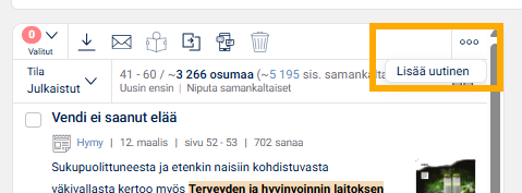Mikäli haluat lisätä portaaliin sellaisen artikkelin, joka ei kuulu seurantapakettiisi, voit lisätä sen manuaalisesti kohdasta Monitor -> Manage -> kolme pistettä -> Lisää uutinen (jos käyttäjätunnuksesi taso riittää tähän).