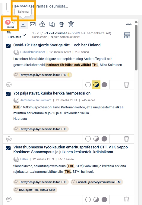 Voit luoda raporttiyhteenvedon osumista keräämällä ensin osumat valitsemalla ne ensisijaisten osumien vasemmalla puolella olevan ruudun kautta. Kun olet merkinnyt jokaisen osuman ruutuun, paina sitten valikkorivillä Tallenna.