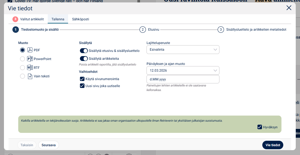 Huom.! Muista aina klikata tekijänoikeuslauseke hyväksytyksi, jotta saat vietyä tallennuksen loppuun!