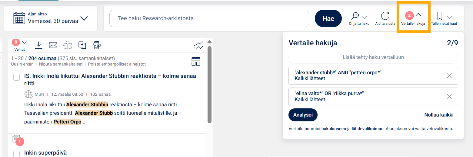 Näet listassa tallentamasi haut. Voit valita haluamasi haut ja painaa Analysoi. Mikäli haluat verrata itse tekemääsi hakua tallennettuihin hakuihin, voit syöttää hakulausekkeen hakukenttään ja painaa Lisää tehty haku vertailuun. Jos haluat aloittaa vertailun alusta niin paina Nollaa kaikki.