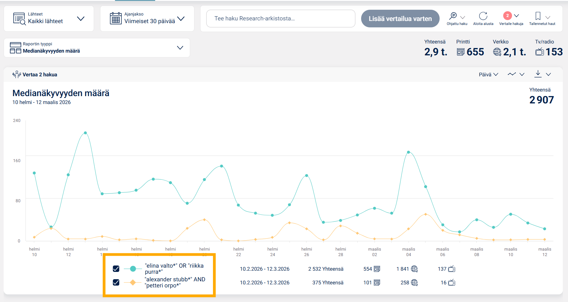 Tässä artikkelissa kerrotaan, kuinka voit vertailla Media-arkistossa tekemiäsi hakuja.