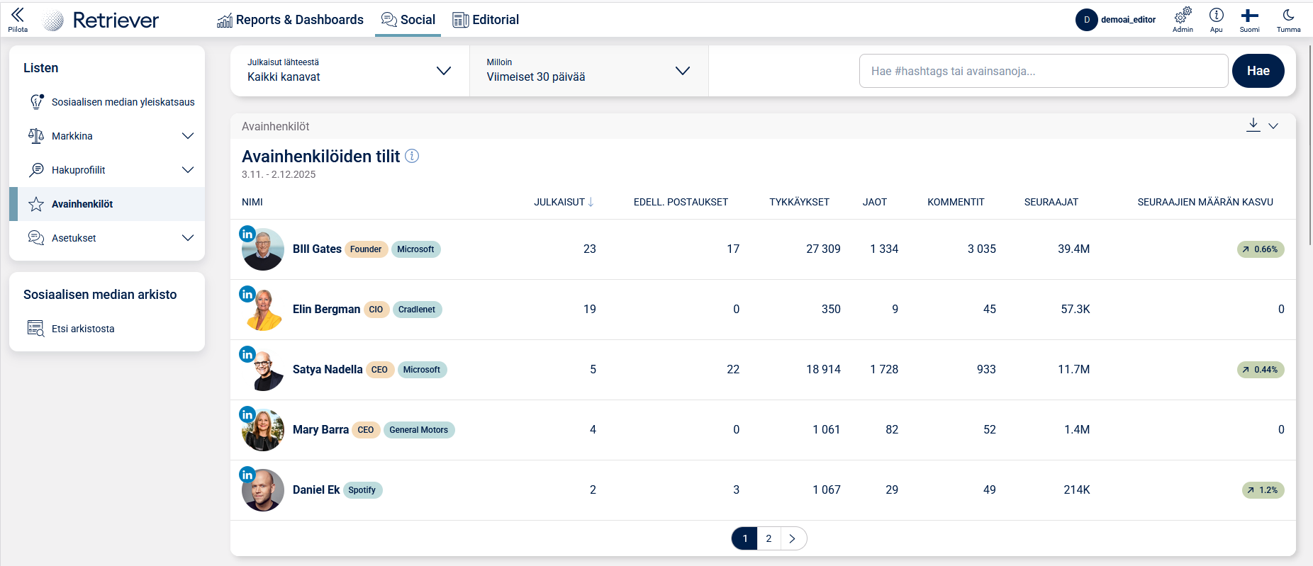 Uuden avainhenkilöiden seuraamisominaisuuden, Avainhenkilöiden, avulla voit helposti seurata ja analysoida tärkeimpiä ääniä, jotka muovaavat keskustelua brändisi ympärillä sosiaalisessa mediassa. Ominaisuuteen voit sisällyttää sekä omat avainhenkilösi että kilpailijoidesi avainhenkilöt ja saada näin laajemman kuvan sosiaalisesta kentästä.