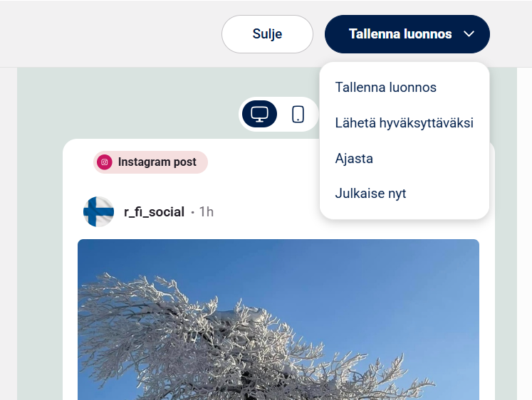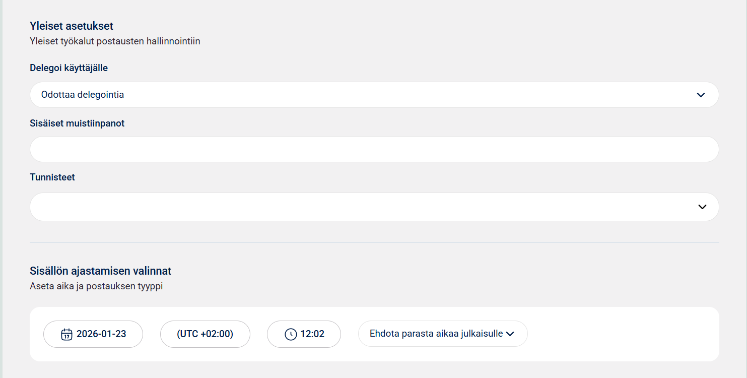 9. Nyt voit valita, tallennatko luonnoksen, delegoitko julkaisun toiselle käyttäjälle, lisäätkö siihen sisäisiä muistiinpanoja tai tunnisteita ja valita, ajastatko sen vai julkaisetko välittömästi