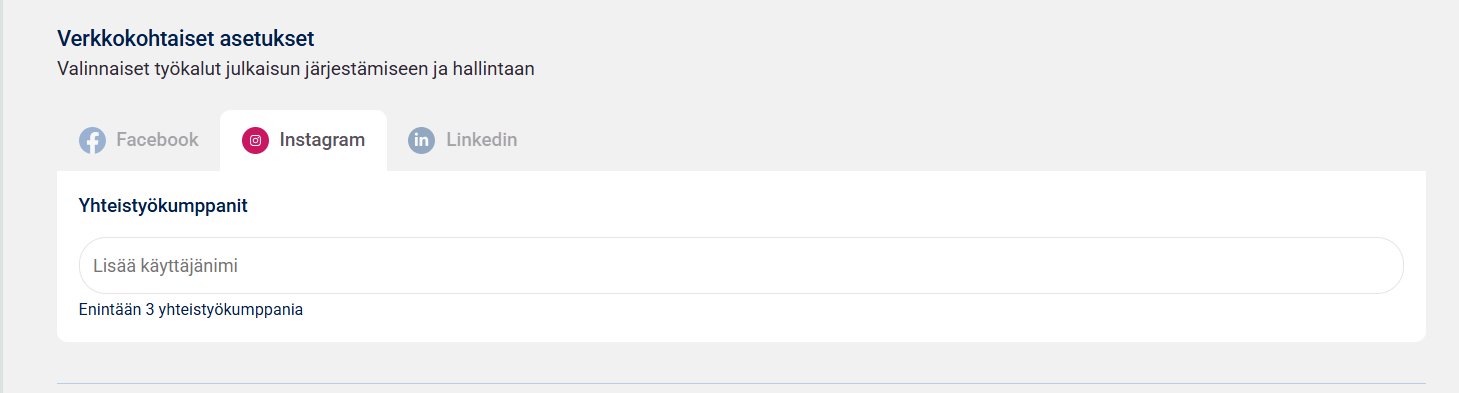 8. Voit myös lisätä julkaisuun yhteistyökumppanin (yhteistyökumppani saa tästä tiedokseen sähköpostiviestin ja voi sen jälkeen hyväksyä julkaisun omalle alustalleen)
