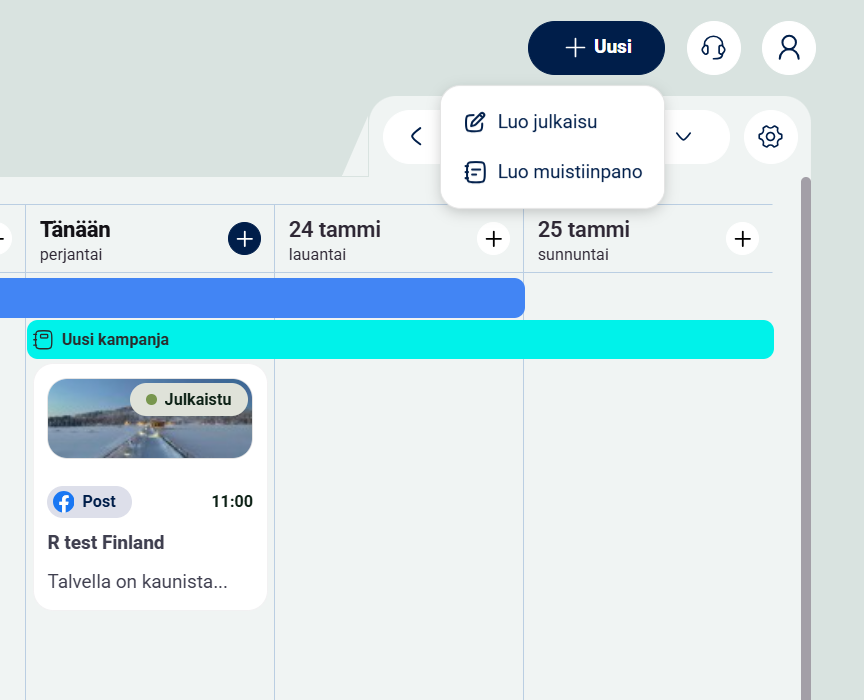 2. Klikkaa oikean yläkulman valikosta +Uusi ja valitse sieltä Luo julkaisu