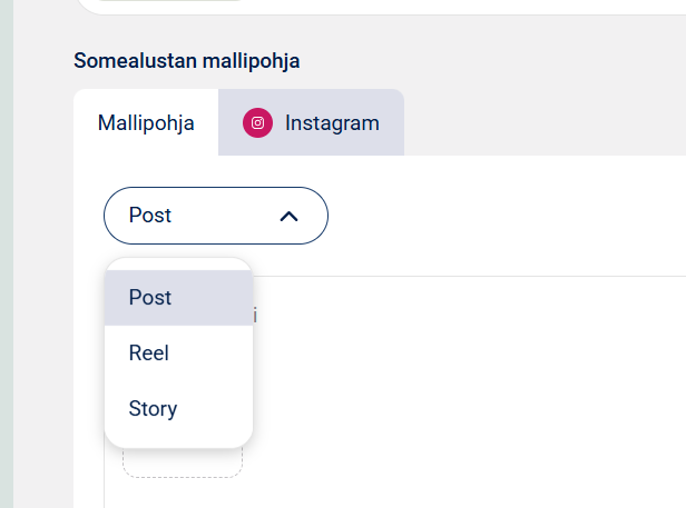 4. Valitse, minkälaisen julkaisun haluat tehdä (Instagram: Post, Reel tai Story, Facebook: Post tai Reel, LinkedIn: Post ja TikTok: Post):