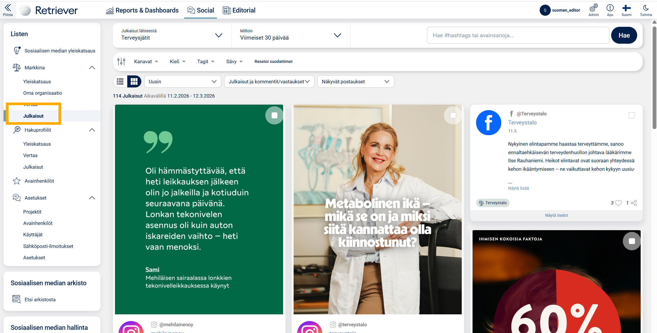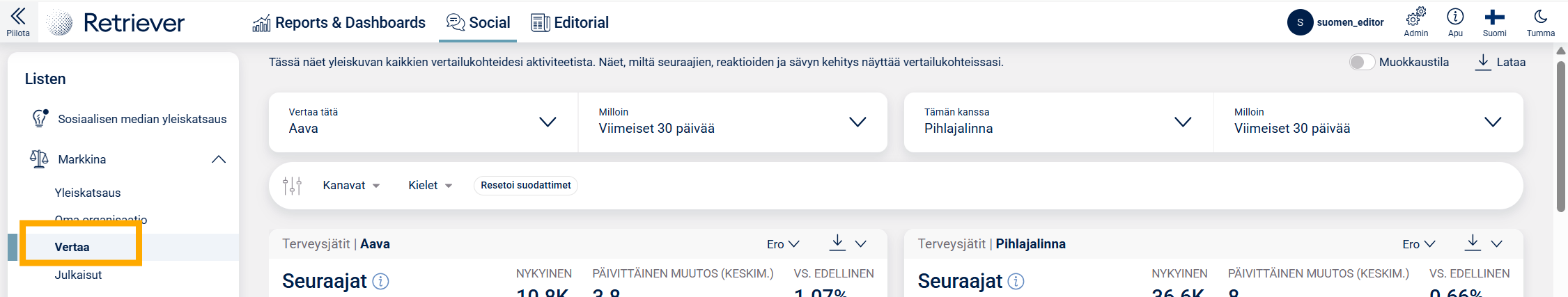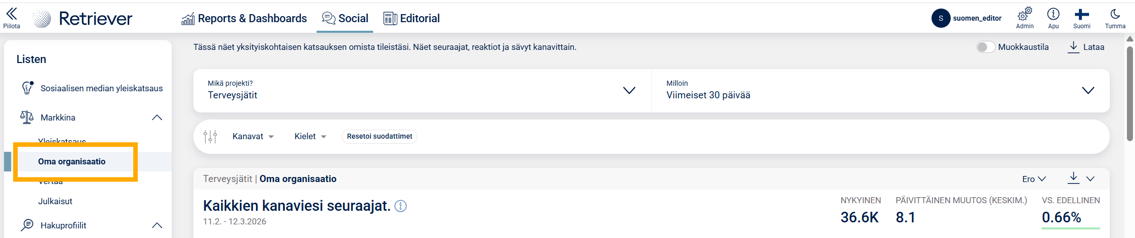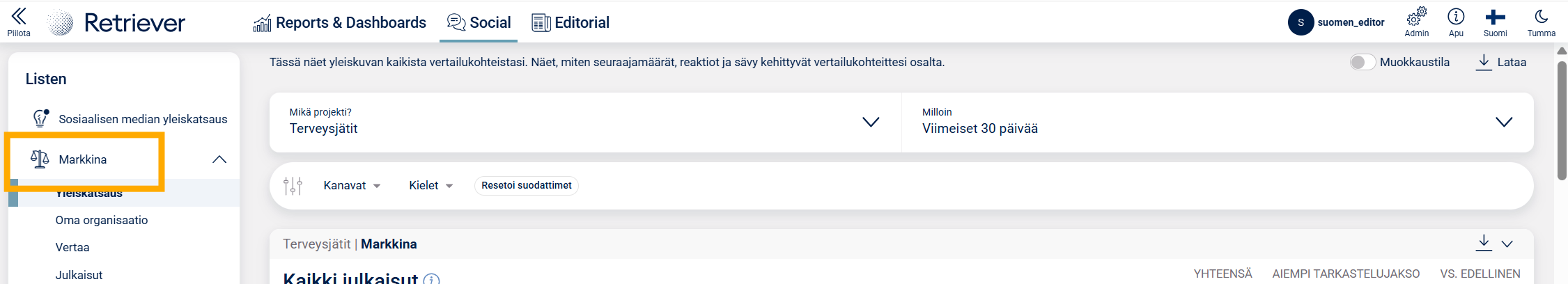 Jos organisaatiollanne ei ole sosiaalisen median seurannassa Markkina-osiota, mutta olisitte kiinnostuneita tutustumaan siihen, ole yhteydessä omaan asiakasvastaavaasi tai laita viestiä osoitteeseen info@retriever.fi