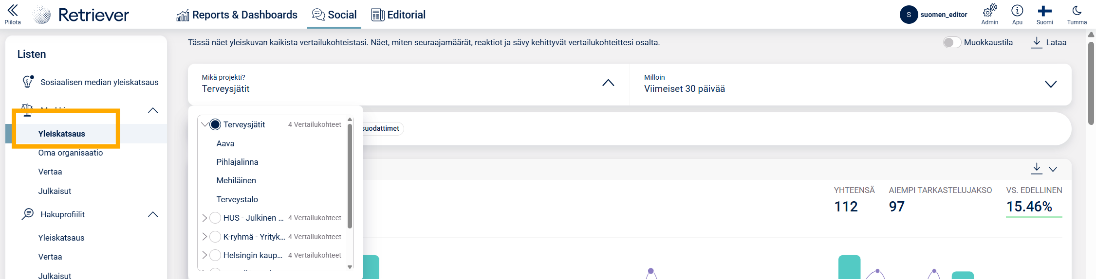 Yleiskatsaus-välilehti näyttää valitsemasi projektin osalta seuraajamäärät, julkaisut, osuuden seuraajista tileittäin, osuuden seuraajamäärien kokonaiskasvusta tileittäin, kaikkien benchmark-tilien postaukset ja ja päivittäiset sitoumukset, reaktiot tyypeittäin tileittäin, sitoutumisen, sävyn, suosituimmat hashtagit, avainsanat sekä julkaisut. Pääset täällä näkemään nämä tiedot joko kaikkiin kanaviin perustuen tai valitsemaan tiedot kanavittain.