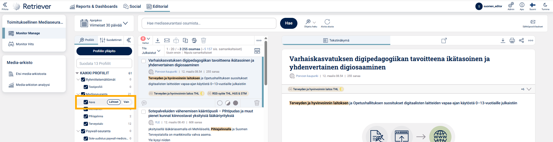 Nähdäksesi, mitä lähteitä sopimuksesi pitää sisällään, vie Monitor Hits- tai Manage -näkymässä hiiresi haluamasi profiilin päälle ja valitse sitten Lähdeaineisto.