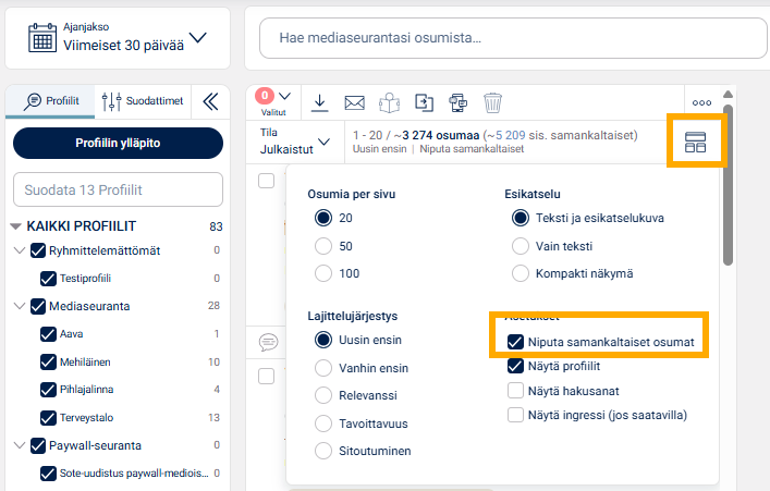Järjestelmässä on oletuksena suodatin, joka kerää vähintään 80-prosenttisesti samankaltaiset mediaosumat yhden osuman alle. Jos haluat kuitenkin nähdä kaikki hakuprofiilin osumat erillisinä, voit poistaa niputuksen Manage- tai Osumat-tilassa Esikatselu-kuvakkeen kautta.